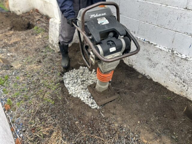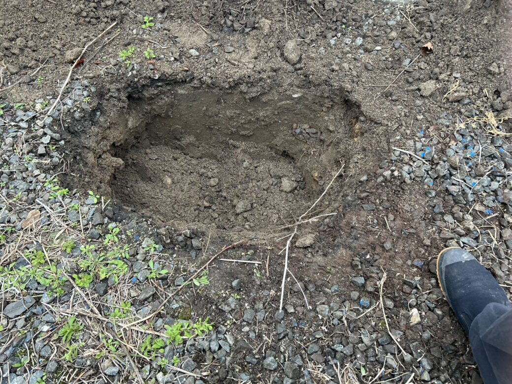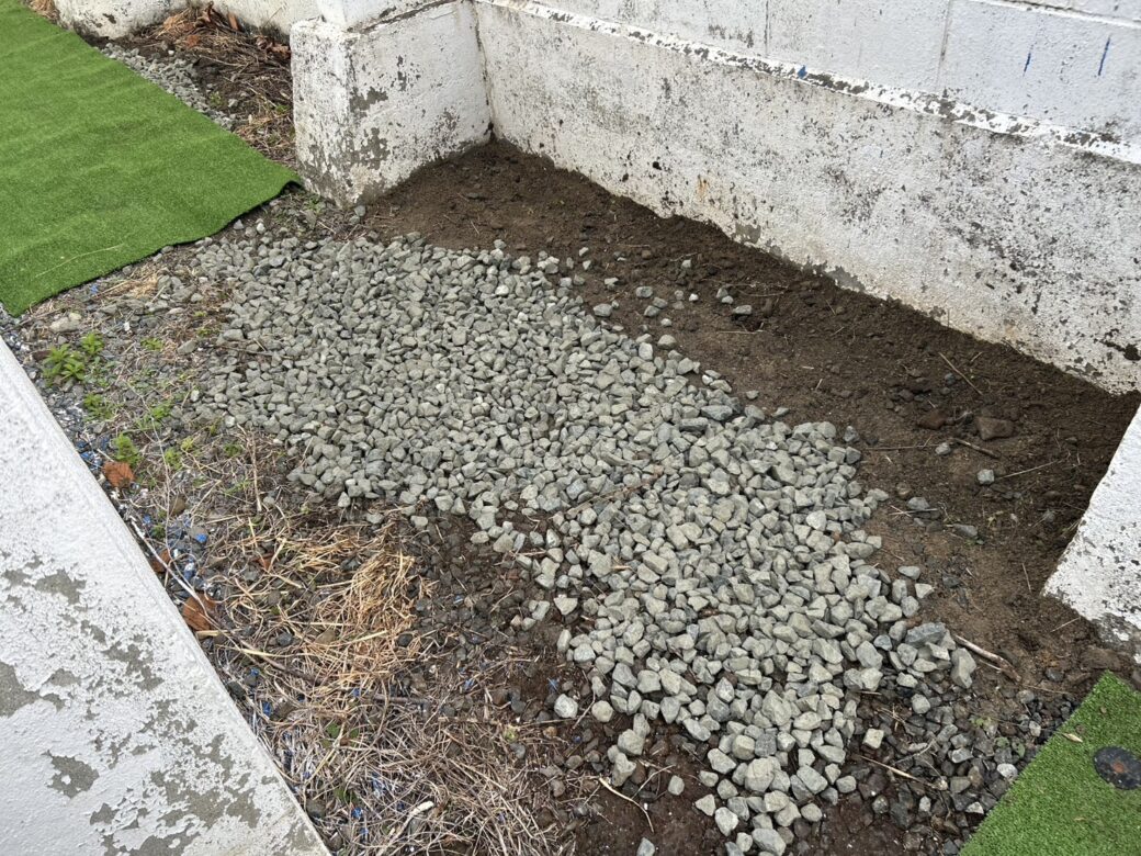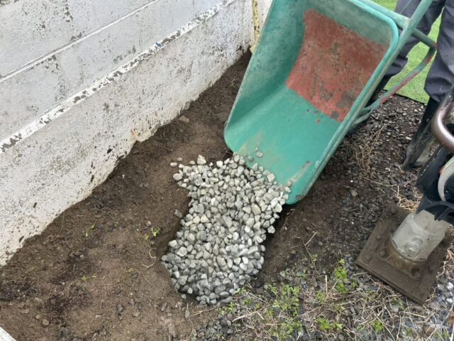 今回はひとまず陥没した部分のみの補修という依頼でしたので、流されないよう砂利(単粒)を敷き詰めしっかりと転圧して作業完了です!!
